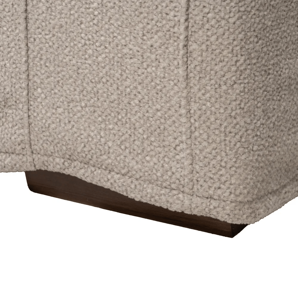Puf en color gris, mostaza o beige fabricado en tela Velar, combinado con madera de pino.