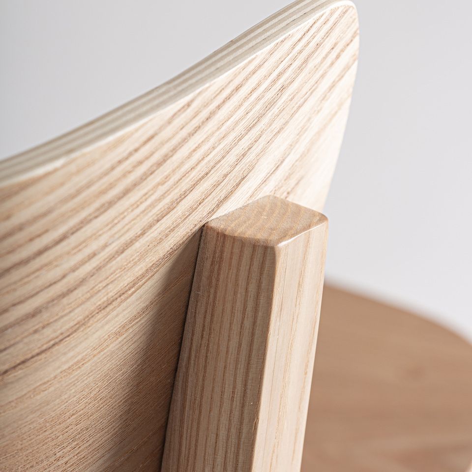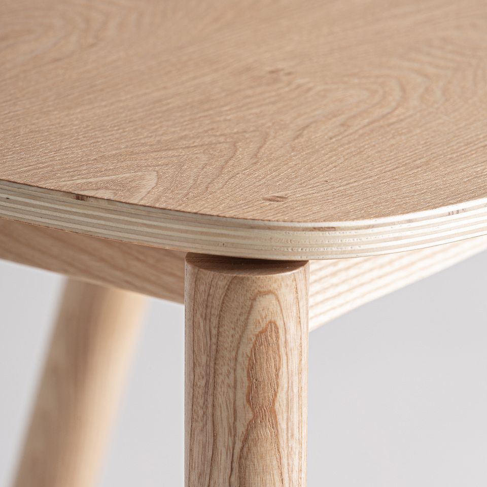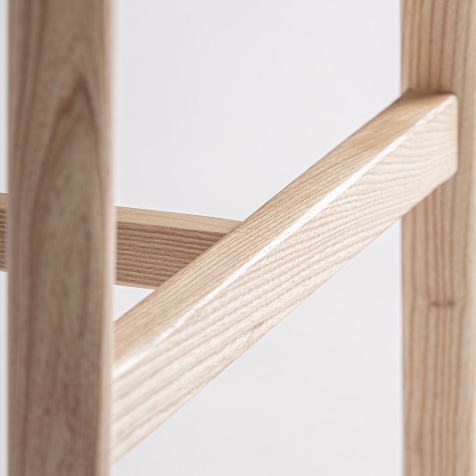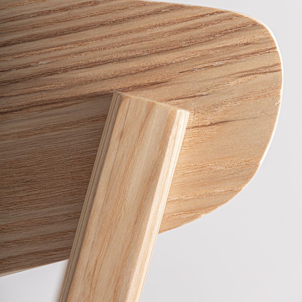 Fabricado en madera de fresno en color marrón claro, combinada con madera contrachapada, destaca por la calidez de sus acabados y por la riqueza visual de la veta, que aporta carácter sin perder sobriedad. Su estructura ofrece estabilidad y confort, mientras que el reposapiés integrado mejora la ergonomía y el uso diario.