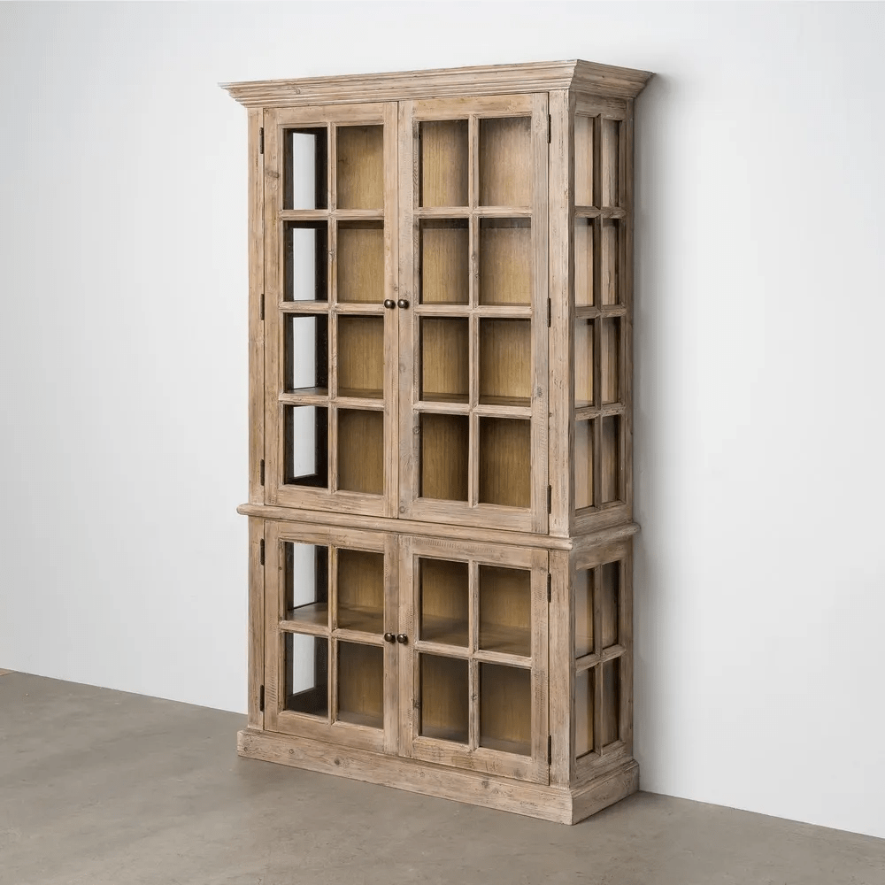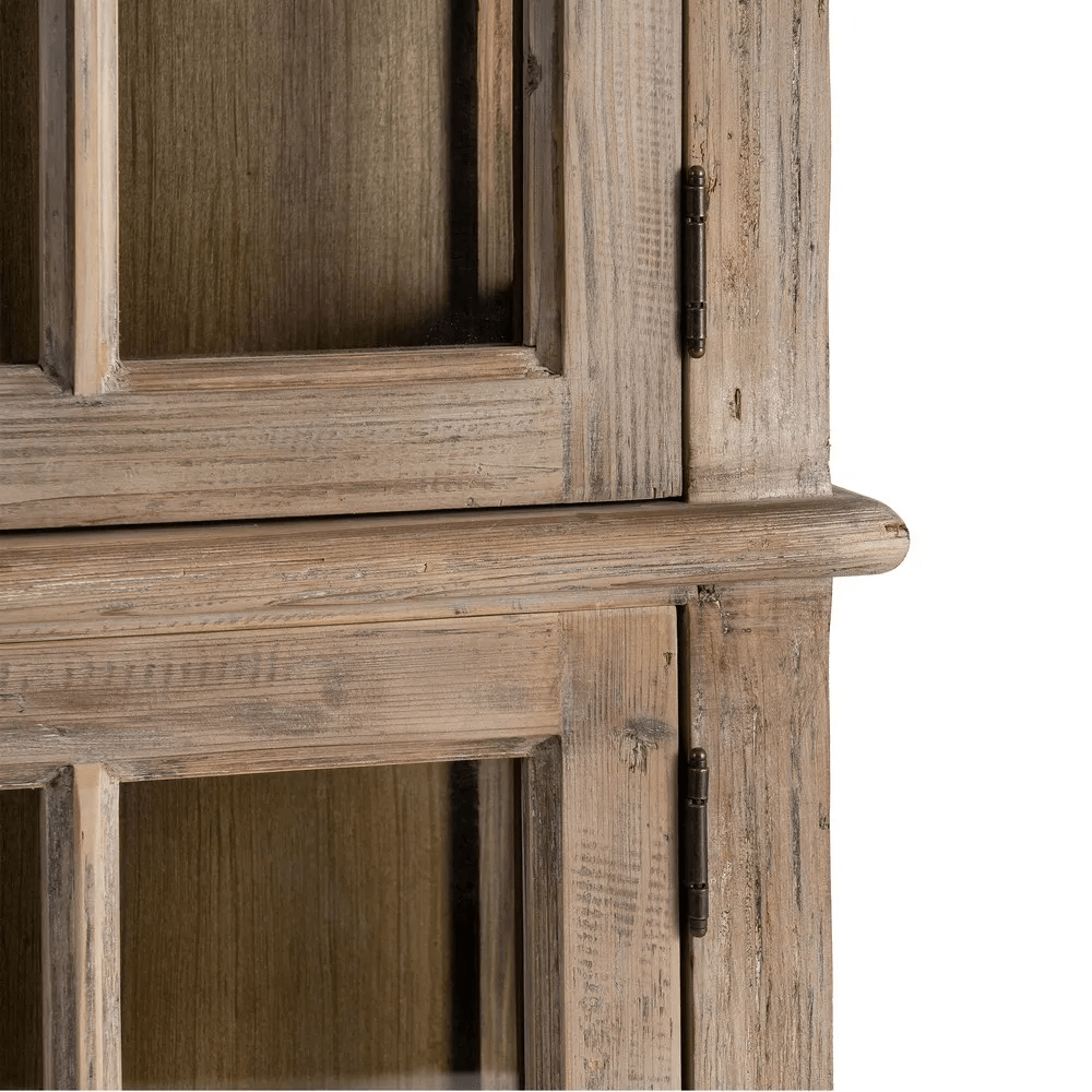 Esta vitrina combina la belleza natural de la madera de pino reciclada con la ligereza y transparencia del cristal, creando una pieza funcional y decorativa que aporta luminosidad y estilo a cualquier espacio. Su diseño artesanal, con acabado envejecido, resalta las vetas y matices únicos del material, haciendo de cada mueble una pieza exclusiva.